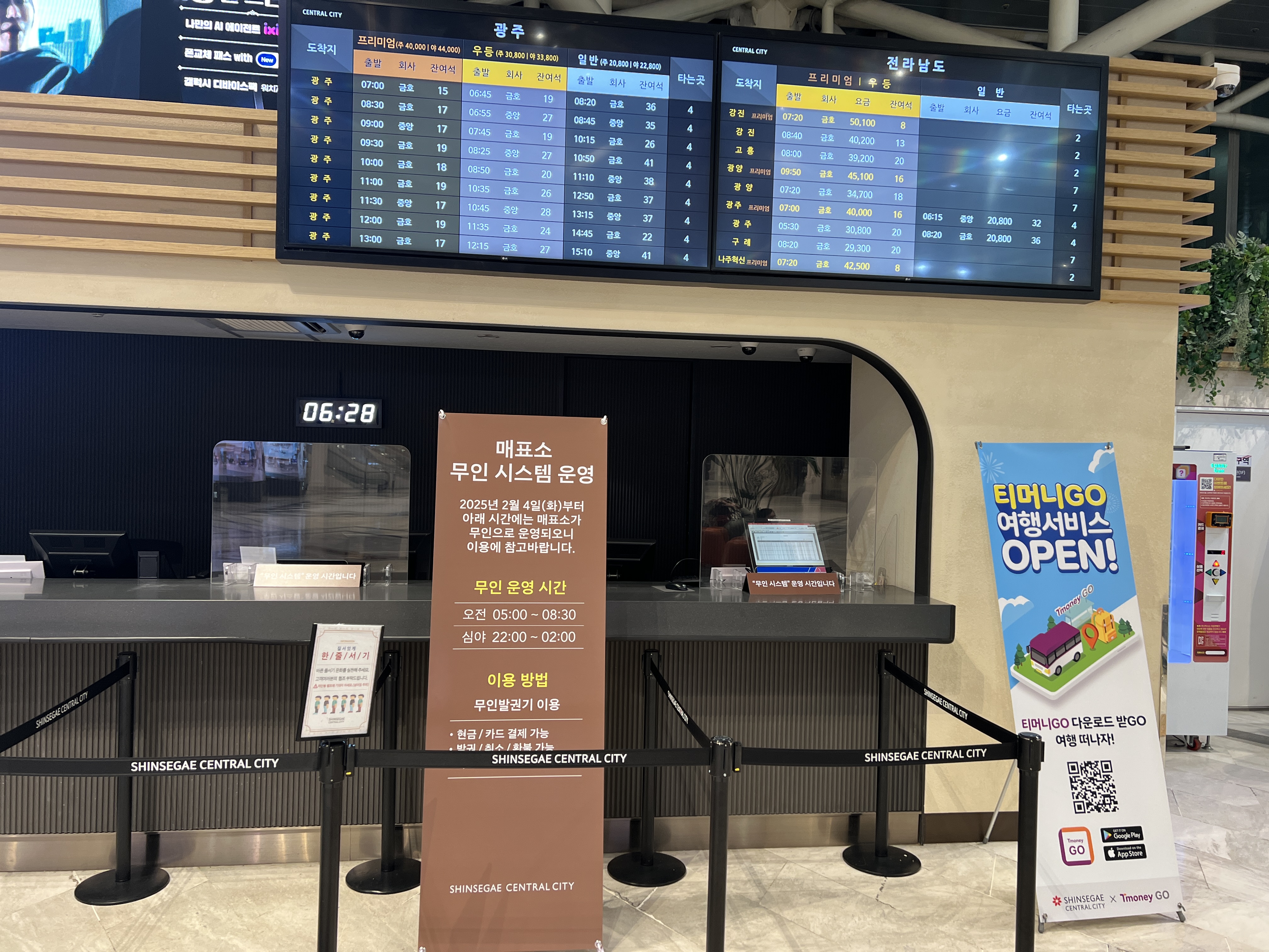 전광판에서 실시간 운행 정보를 확인할 수 있으며, 발권기에서 좌석 선택도 가능합니다.