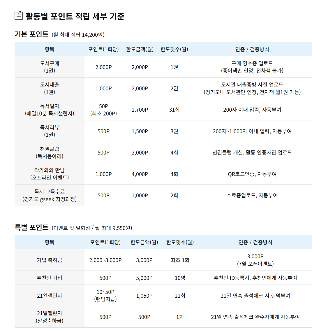 | 도서 대출 | 1,000P | 월 2권 |