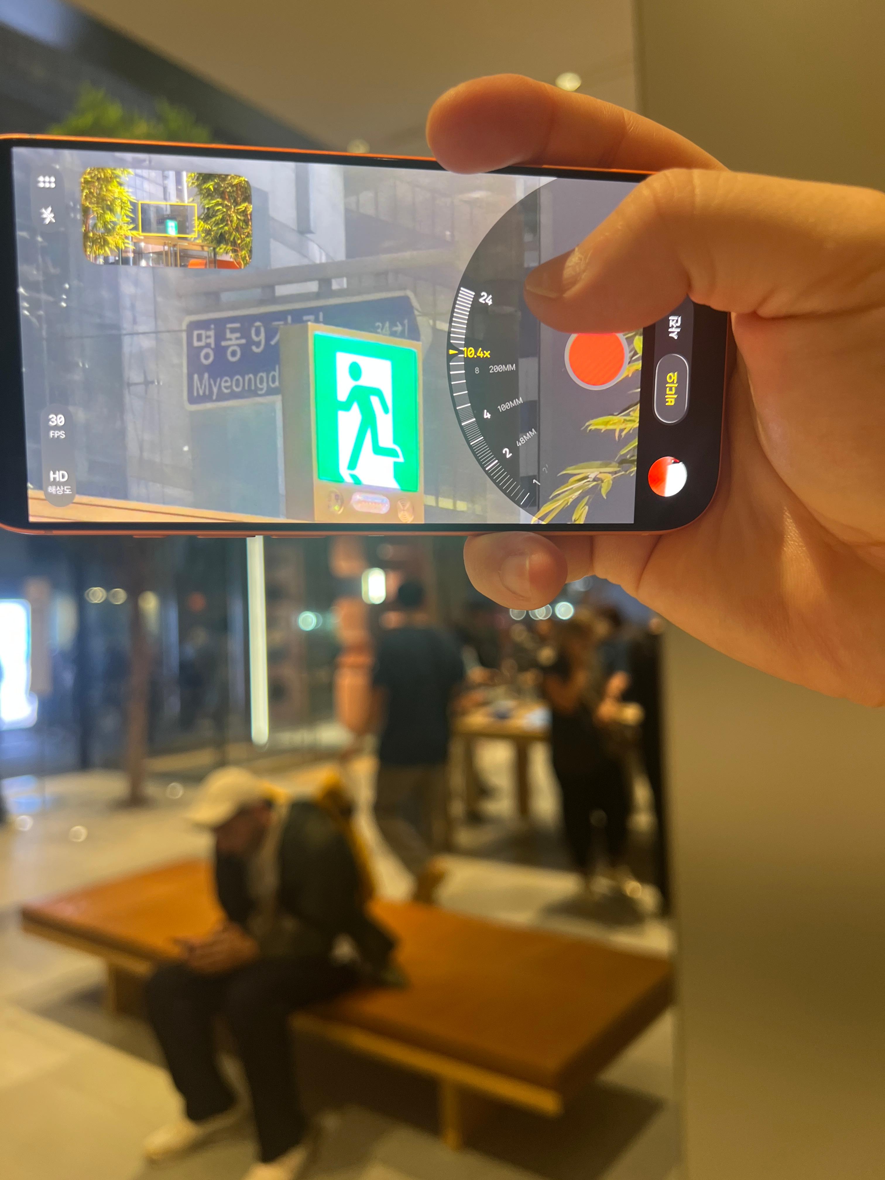 👉 실제로 애플스토어에서 테스트해본 결과, 멀리 떨어진 명동9가길 간판과 출구 표지판을 선명하게 당겨 찍을 수 있었습니다.
