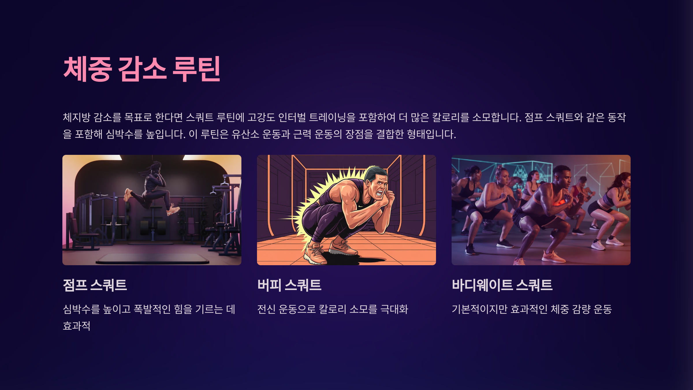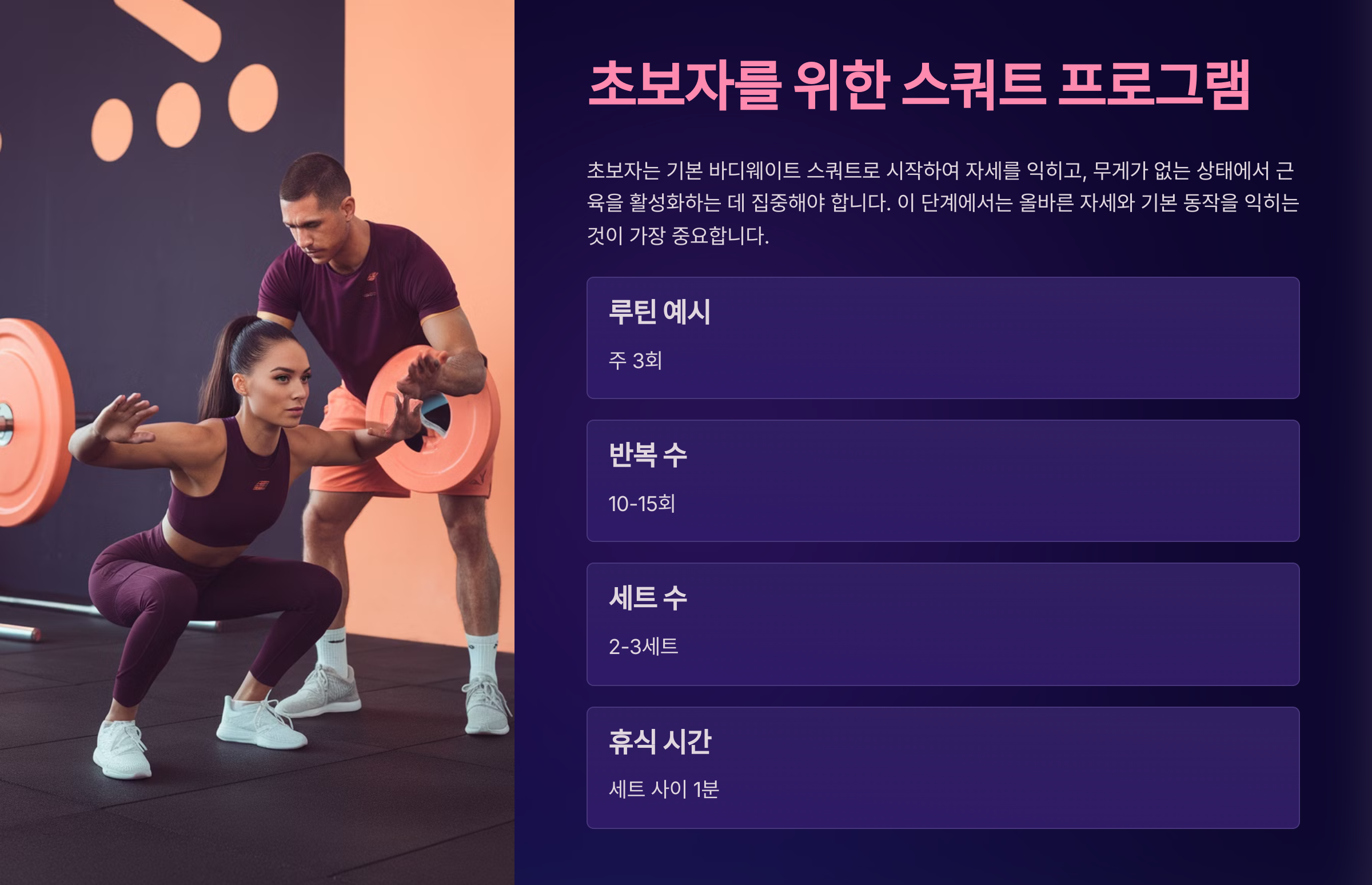 - 루틴 예시: 주 4회 (바디웨이트 스쿼트, 점프 스쿼트)