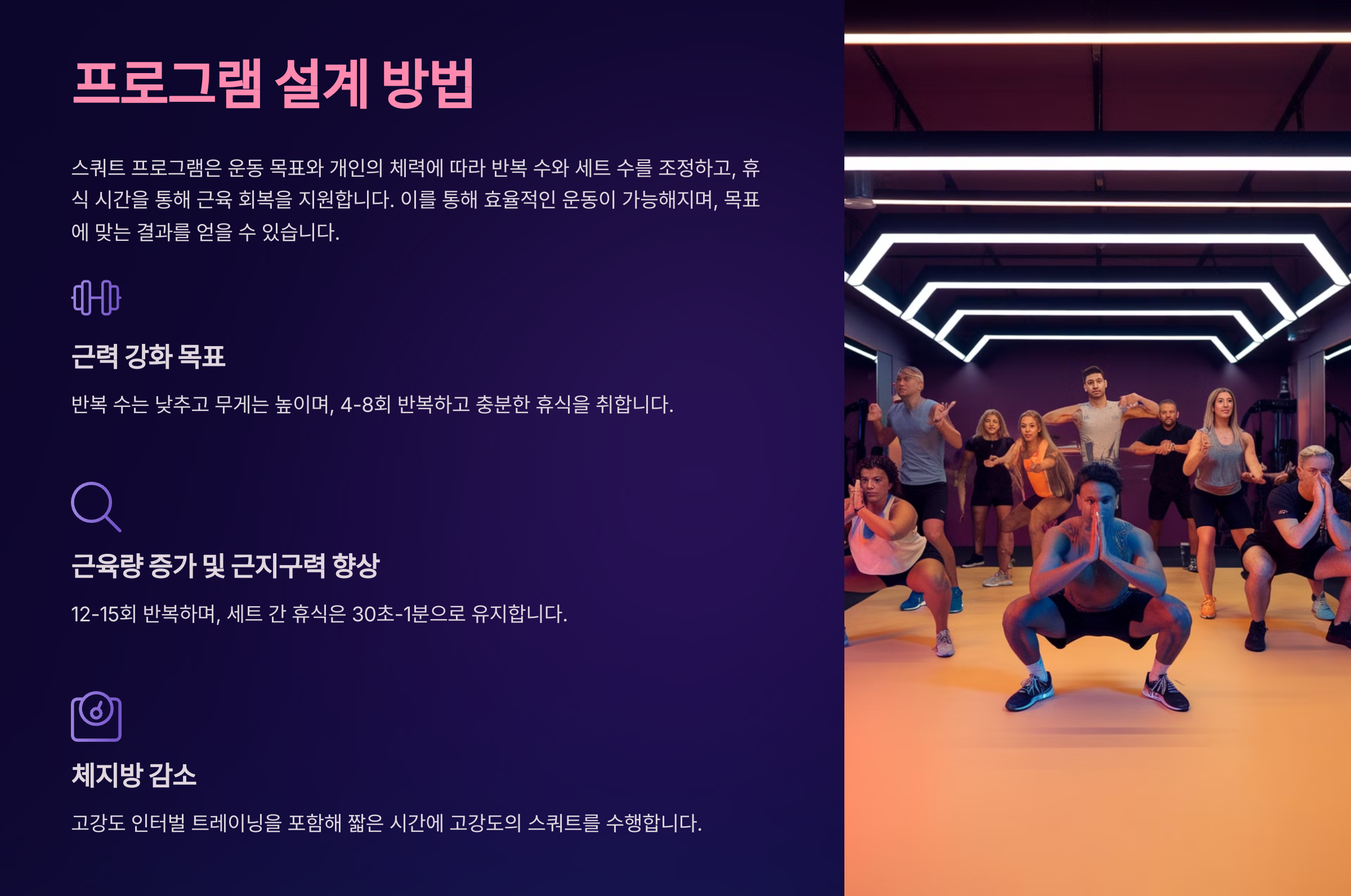 스쿼트 프로그램은 운동 목표와 개인의 체력에 따라 반복 수와 세트 수를 조정하고, 휴식 시간을 통해 근육 회복을 지원합니다. 이를 통해 효율적인 운동이 가능해지며, 목표에 맞는 결과를 얻을 수 있습니다.